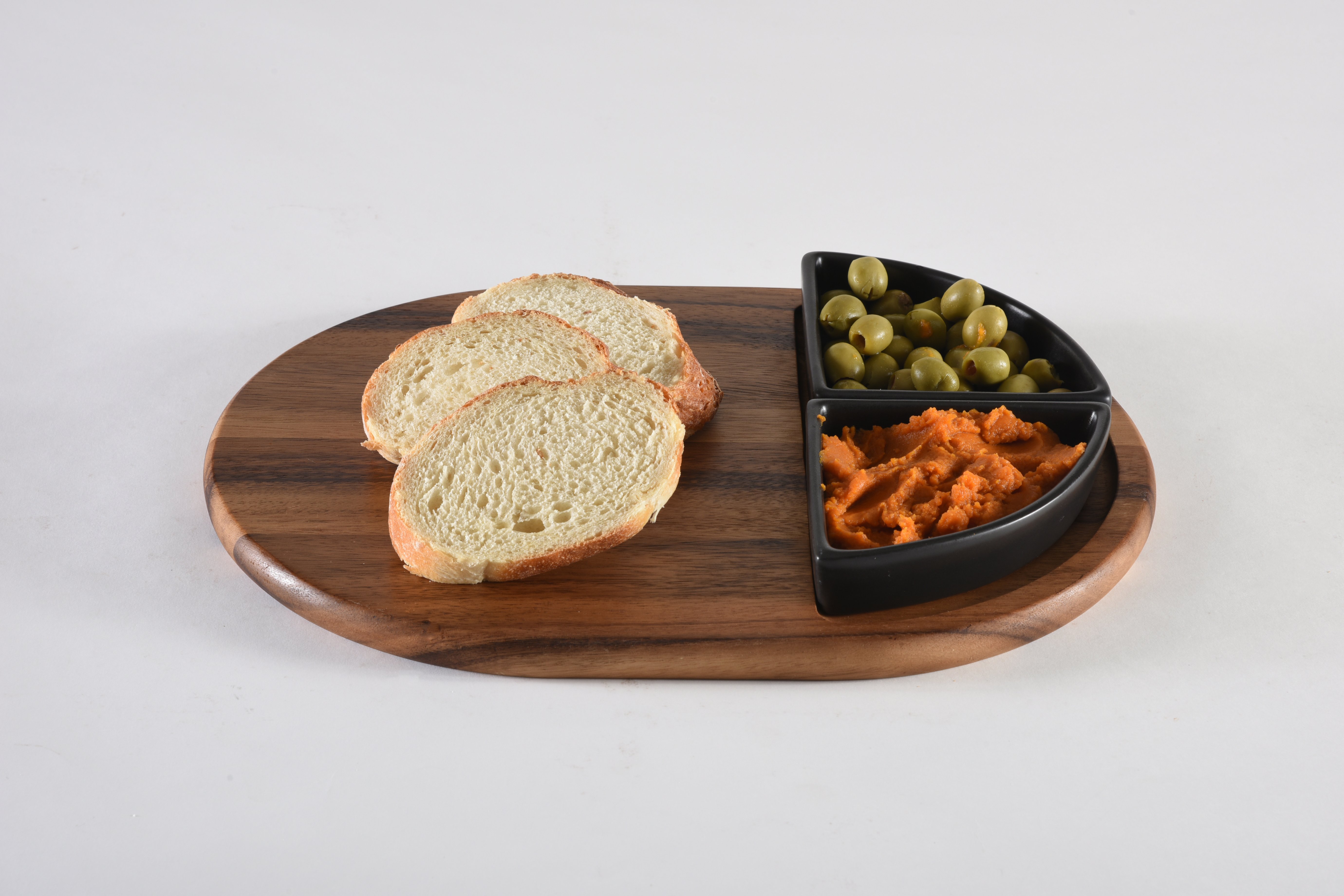 A perfectly sized and beautifully designed charcuterie board with 2 triangular ceramic bowls.  Bowl area routed out just enough to prevent  unnecessary movement and avoid spillage.  Delight your guests by serving cheese; crackers;   hor d'oeuvres;   or any appetizer on this elegant board.  Handcrafted from solid acacia wood; a high-quality hardwood great for culinary applications.  Cleans up easily by wiping with a damp cloth.