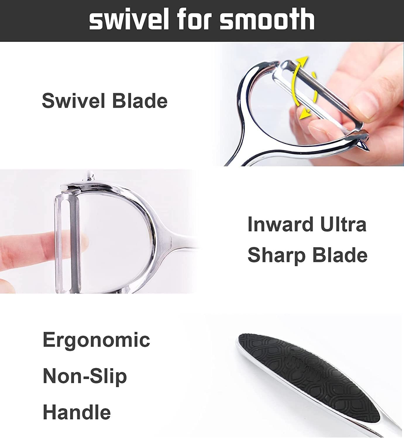5.Suitable for Varieties of Food: The blades of peelers are 60 to 120 degree rotation, which makes the peeler nearly suitable for all shapes food, like carrot, cucumber, potato, eggplant, apple, mango,kiwi, pair, chocolate etc. The width of blade is 4cm, you can peel vegetables or fruits fast and effi
