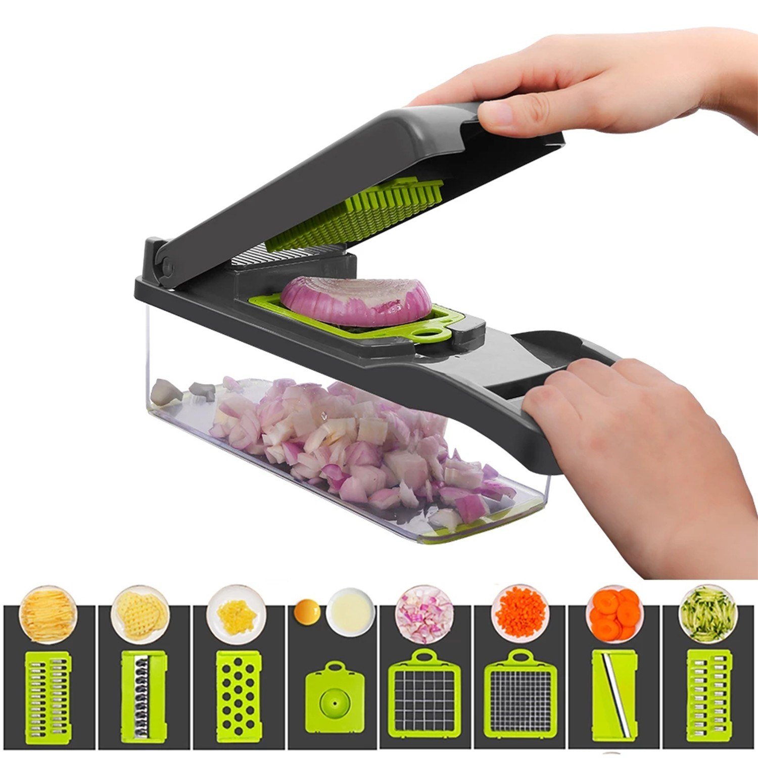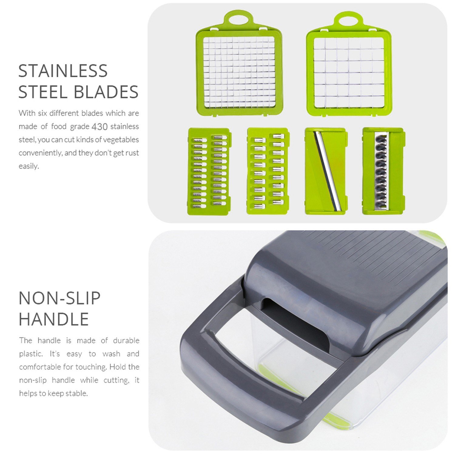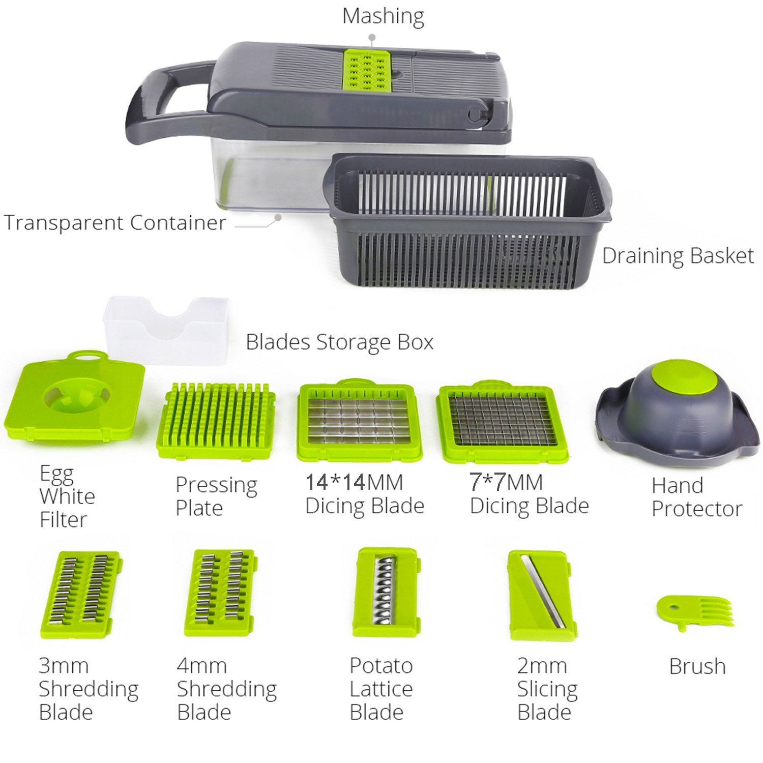• All in One: With different detachable blades, the chopper can be used as a onion dicer(big/small cubes), vegetable slicer, julienne slicer, cheese/vegetable grater. Meet all your needs while prepare your meal